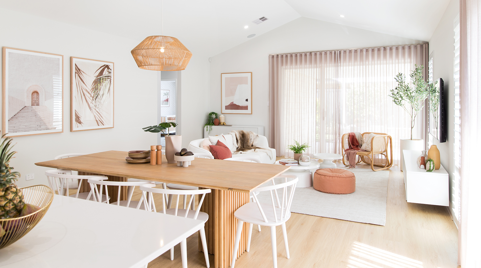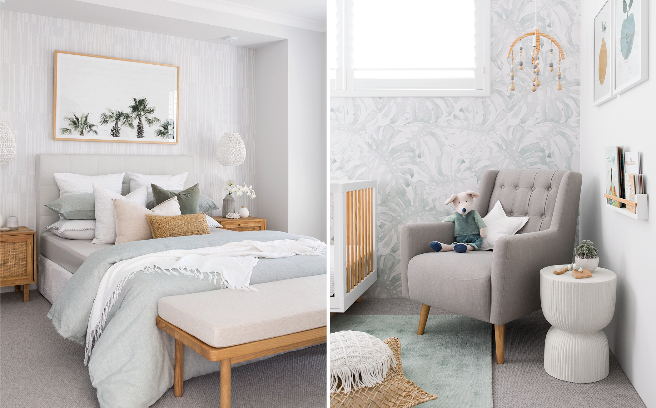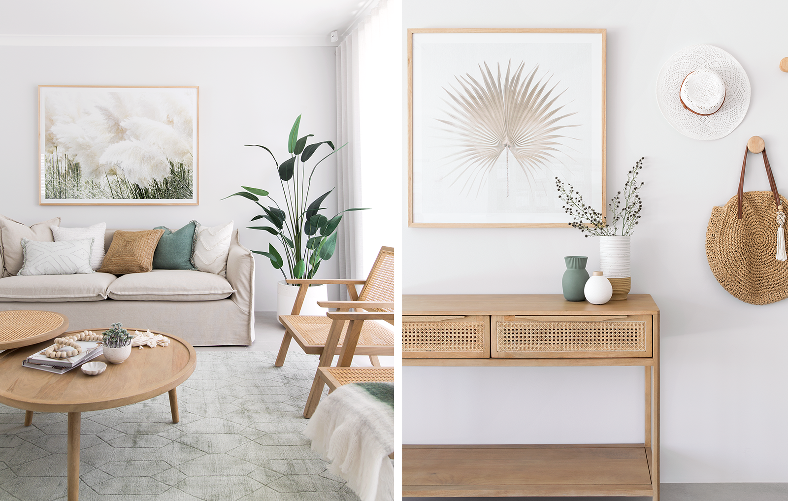 To achieve a Contemporary Coastal interior style there are some simple and effective details you can introduce to emphasise the tranquility and beachy feel of your home. Using a soft feature colour like seafoam green or a greyed blue hue, will bring seaside elements inside and introduce a pop of colour to the space. This can be applied in wallpaper, cushions, feature paint, artwork, rugs or through the use of decor items- like vases, vessels or books. Choose products with raw, organic textures like rattan, straw, linen, cotton and rope. This will enhance a tactile aesthetic and keep your home feeling cosy and inviting, even when using a cooler colour palette.