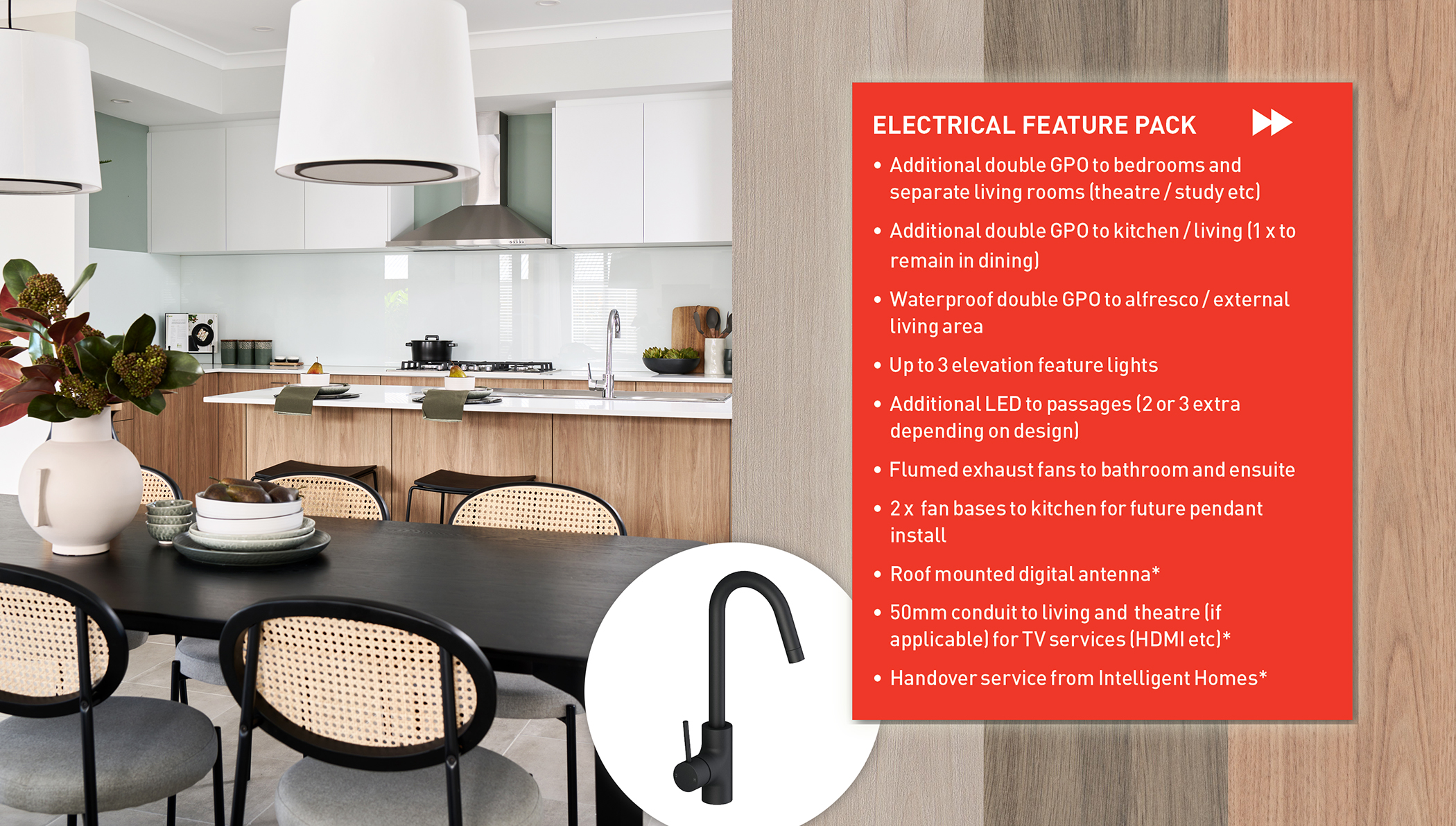 - In selected schemes we have included various upgrades like stunning woodmatt laminate, black tapware and matching hardware for no extra cost!