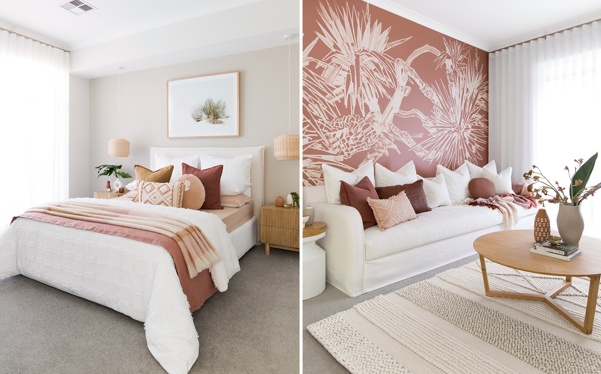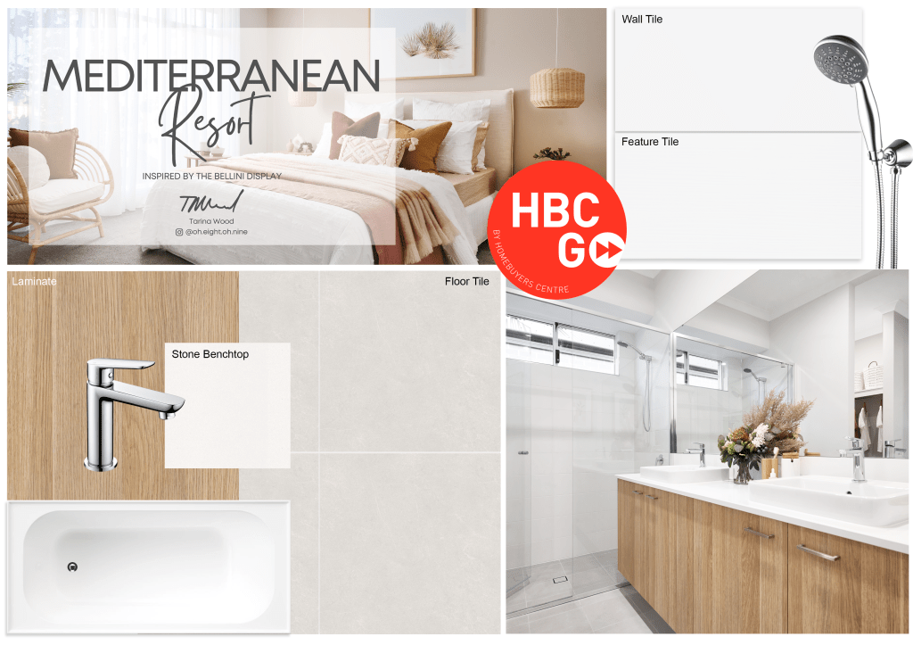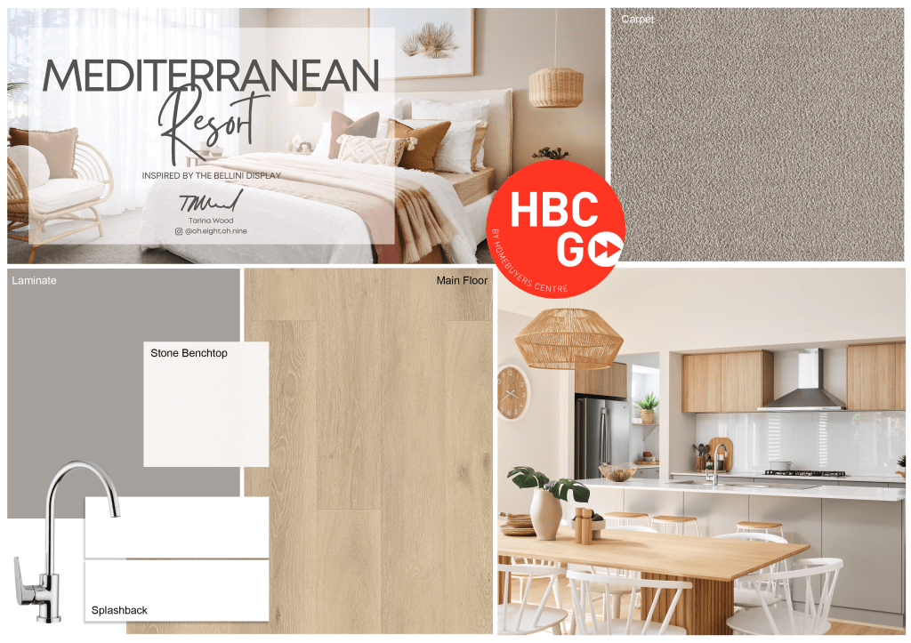 The interior selections of the Mediterranean Resort scheme are timeless and classic, creating a neutral base for you to decorate with a rich, earthy palette after handover. I have chosen a light oak hybrid floor to pair with a warm grey kitchen laminate called Polytec Stone Grey and white splashback tiles to ensure the overall look is light and bright. The bathroom, ensuite and laundry then flow nicely on from the main interior with a natural oak laminate for the vanities and a stunning soft grey/ almost white floor tile (one of my all-time faves.) The neutral cut pile carpet means you can go bonkers on textured furniture and decor, which suits the Mediterranean resort style perfectly!