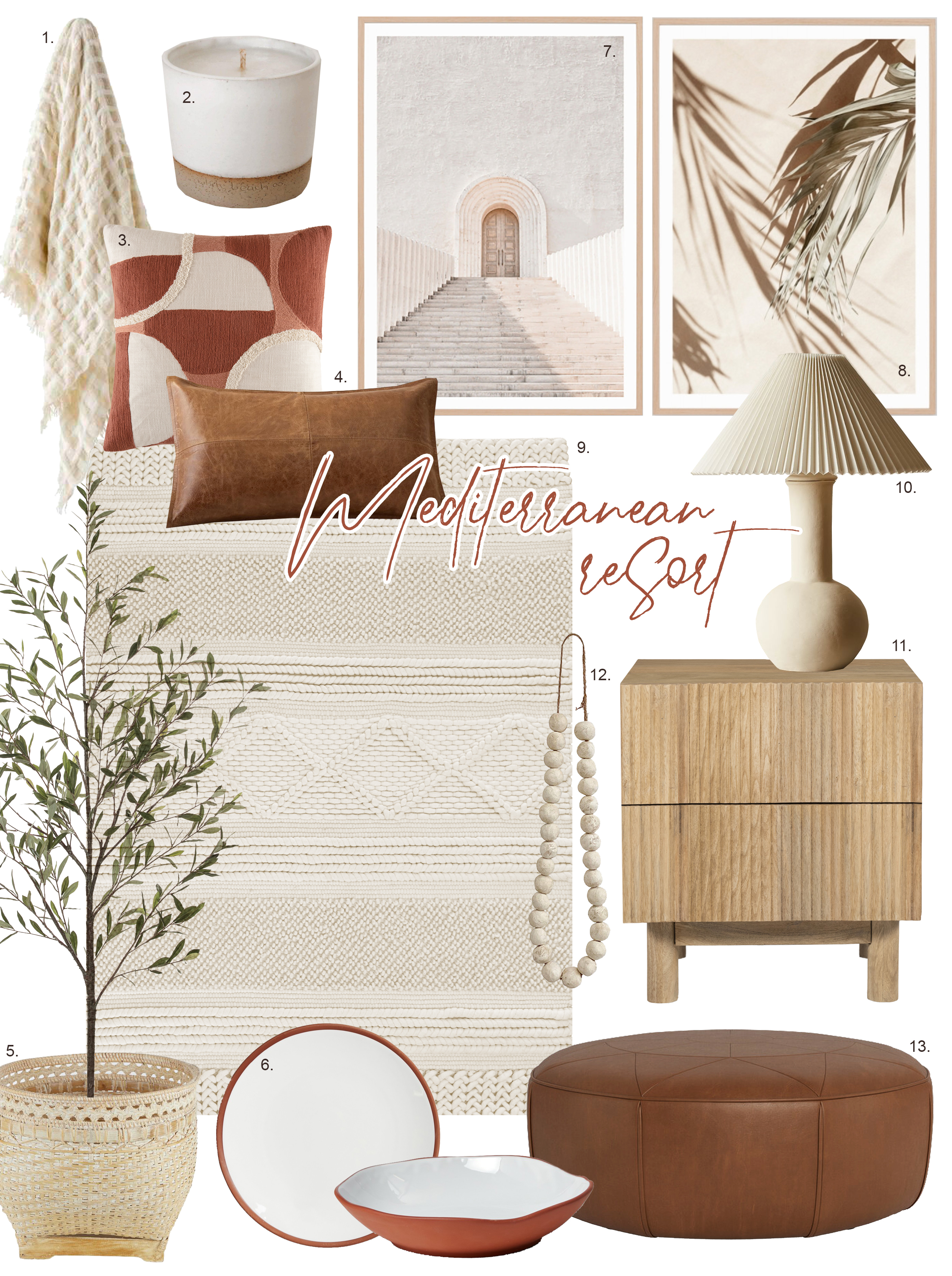 Here is a curated collection of some beautiful and cohesive Mediterranean Resort decor, to help you achieve the look effortlessly. Links below!!