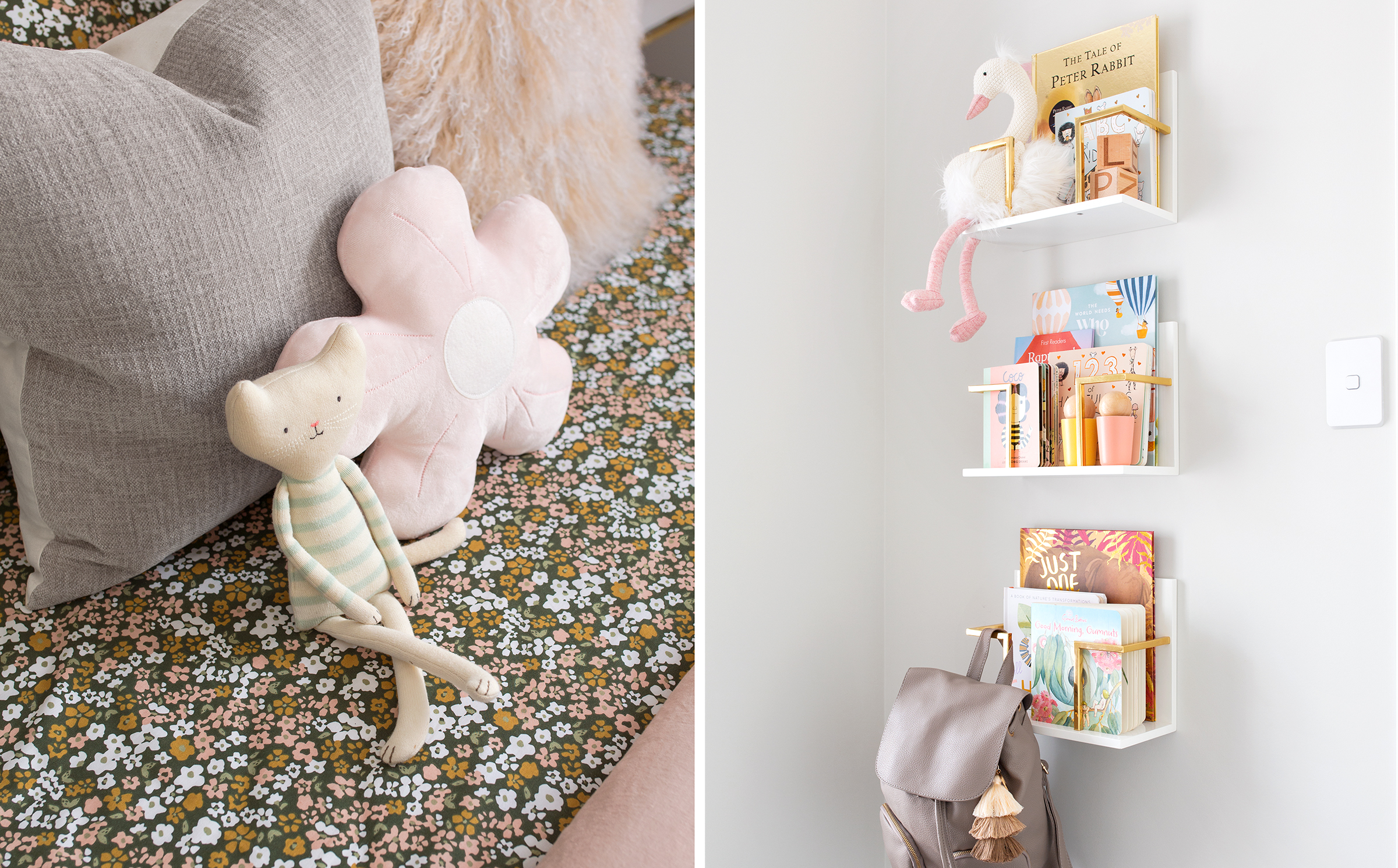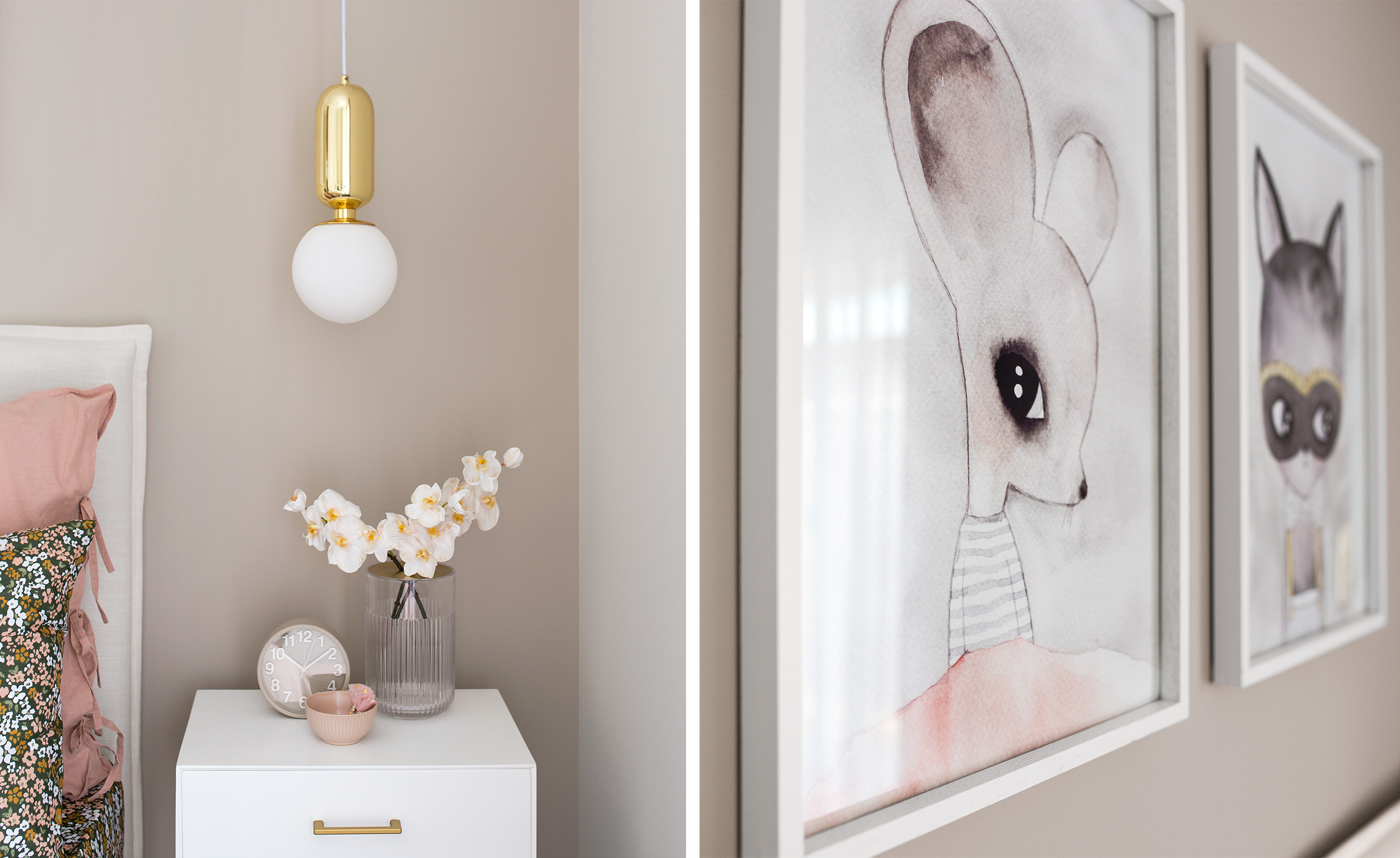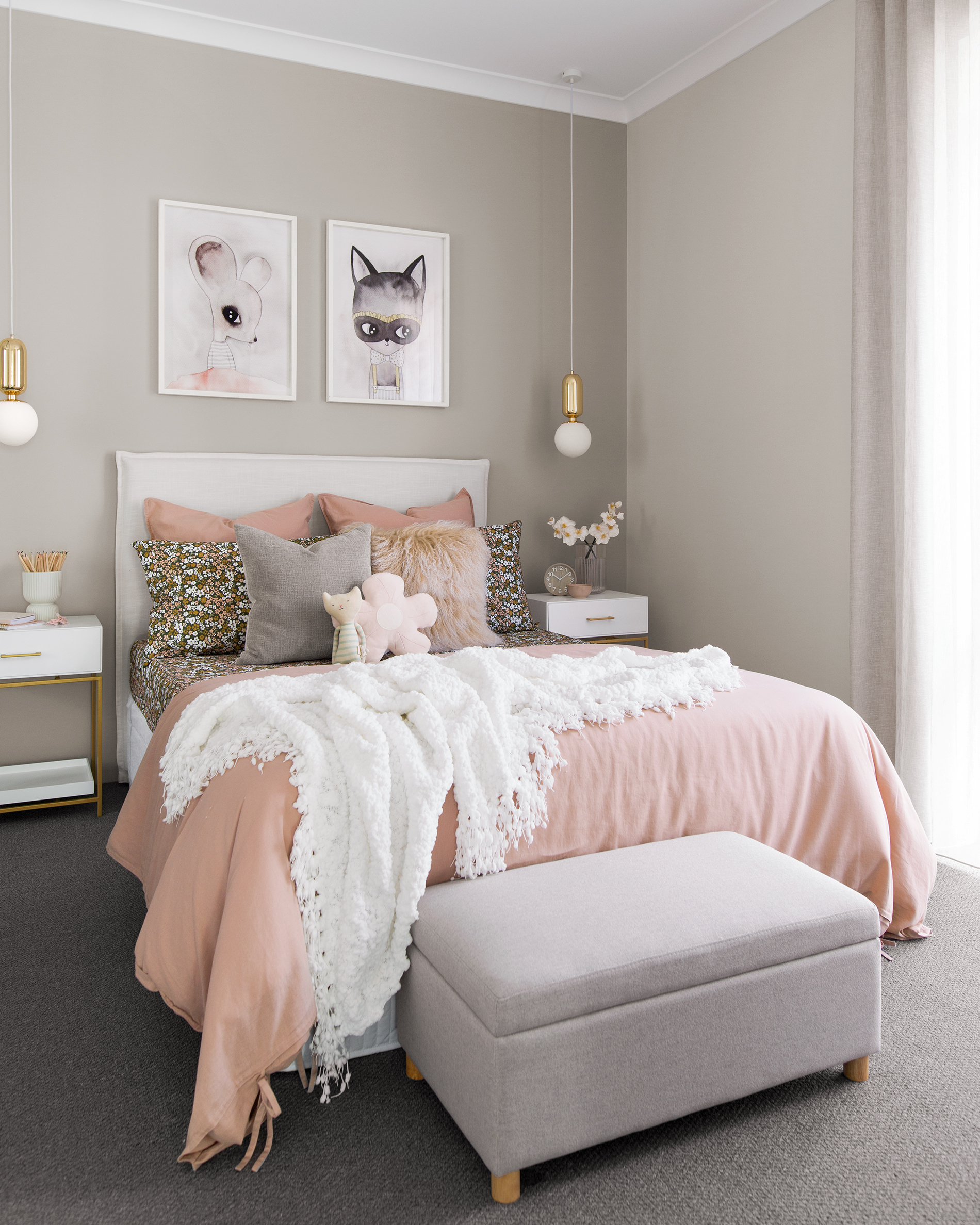 Following on the back of my last post I wanted to share with you all the sweet details of mini Margot’s bedroom. We wanted to stay cohesive with the home’s modern luxe interior style but also introduce younger elements that can easily transition from primary to teenage years. To do this without changing the entire room we kept the base foundation very neutral and then introduced pretty gold details and pops of colour in the decor, art and bedding.