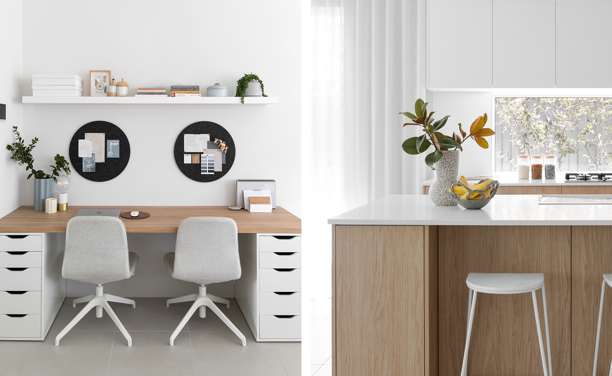 The drawers, shelf and office chairs are all trusty Ikea! They provide a neutral base that pairs well with the rest of the home and also kept costs down. By saving $ on the main items, it allowed me to get a custom 2.4m bench top made in the same laminate as the kitchen (which is directly opposite the study wall.) The top wasn’t overly expensive because it doesn’t have any hard fixings mounted into the back, so the labour time was cut down and the price was reduced.