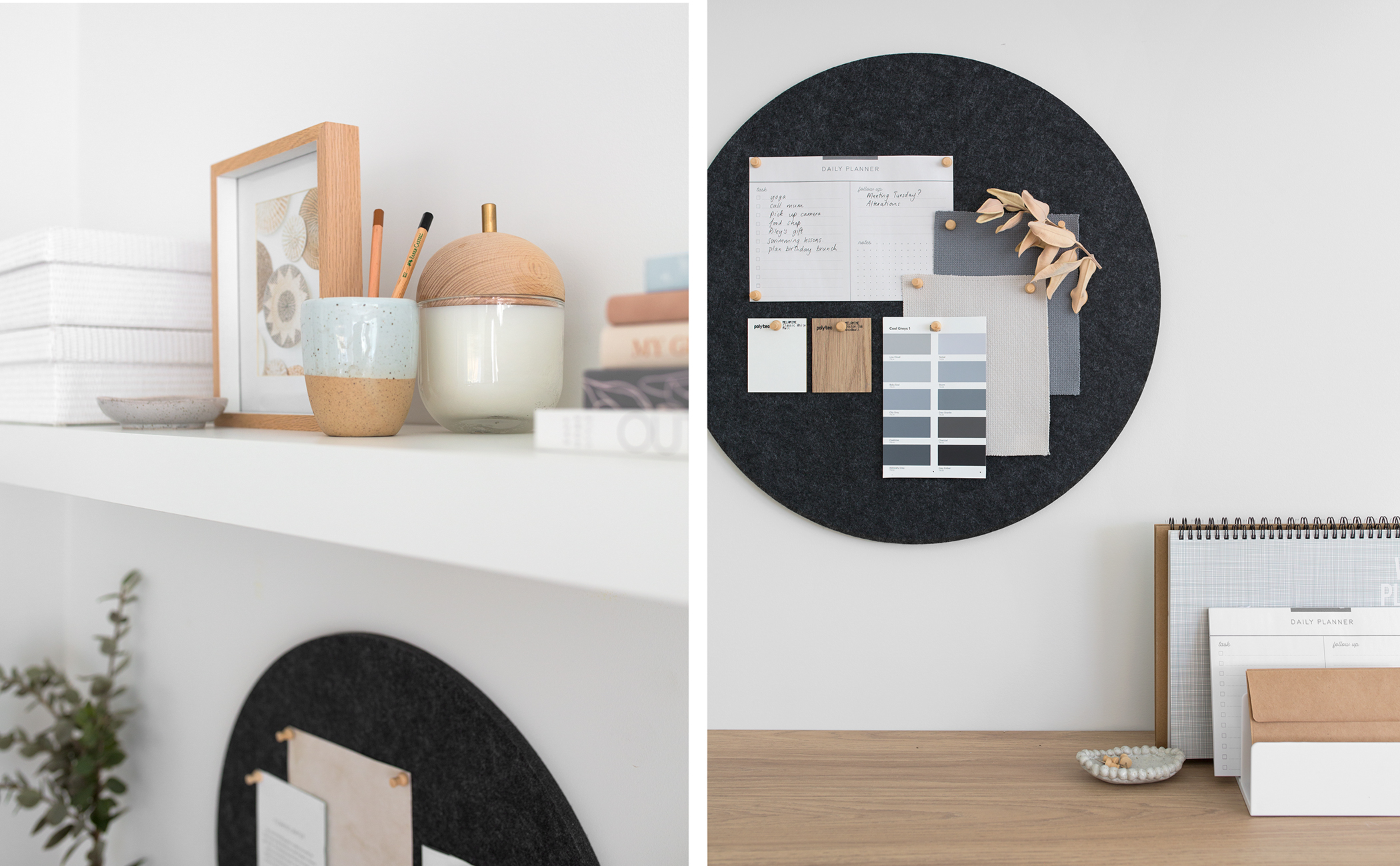 The pinboards are awesome wall decor to display anything and everything- memos, planners, kid’s artwork or merit awards, advent calendars, utility bills (ergh), vision or mood boards, photos or small scale accessories like headphones. Depending on how the pinboards are used, they can add personality to the space and enhance a colour scheme that you’re wanting to achieve (if small artwork prints are styled among the everyday items.) Wooden push pins can also be a stylish way to introduce more oak tones into the area. I found this pack of 80 at Officeworks for under $5.