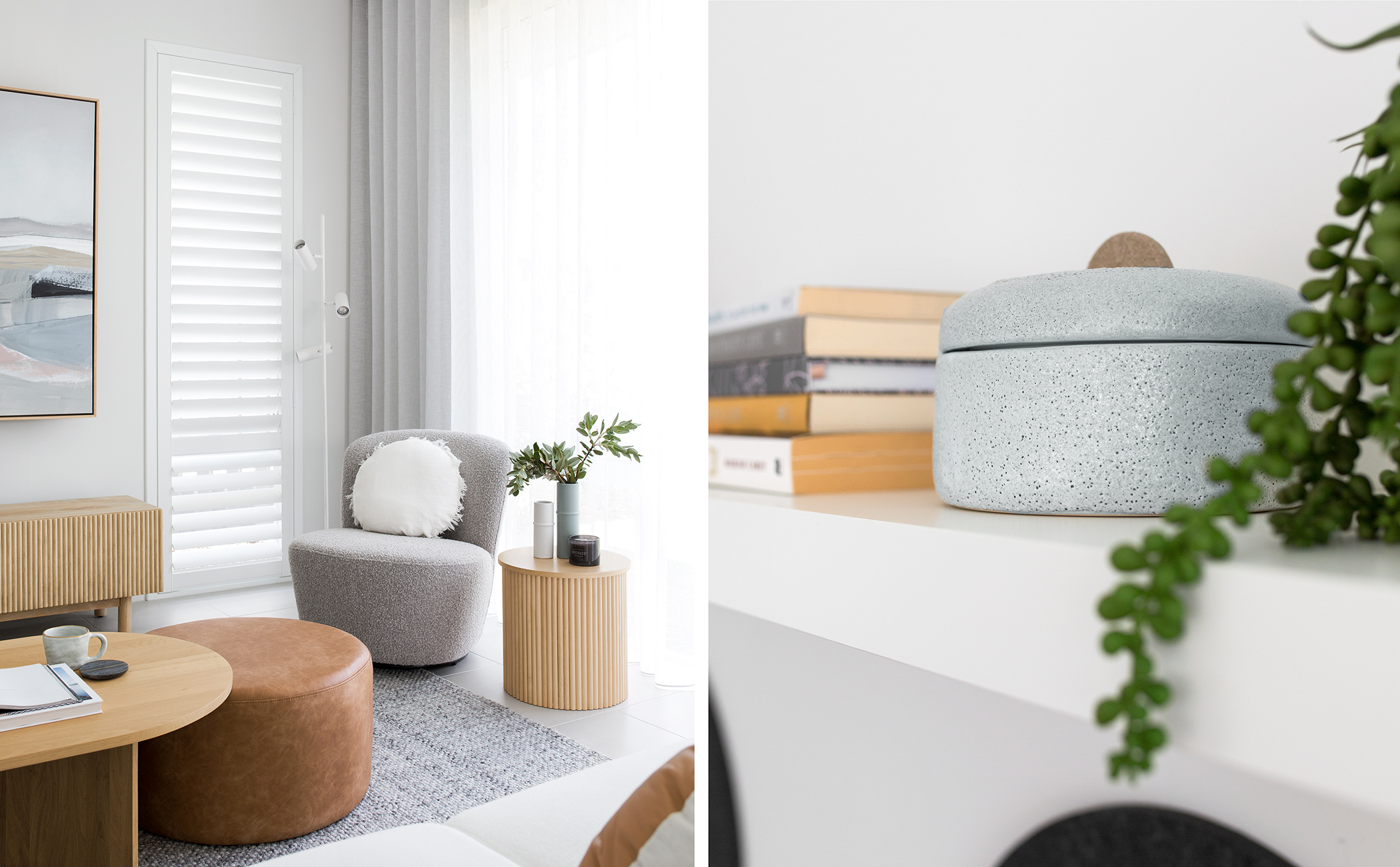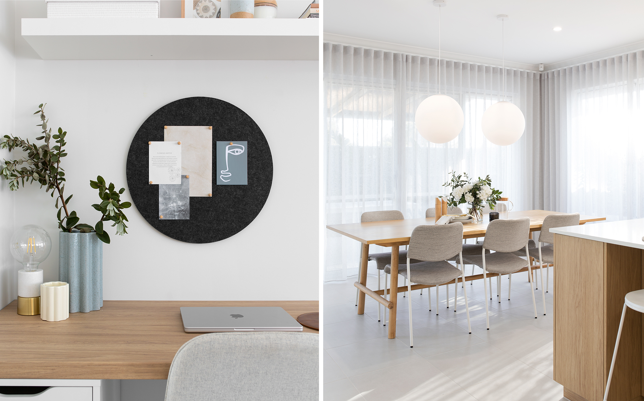 The Bayside study nook is directly in front of the kitchen and beside the dining and living room (in one large open area) so I wanted to keep the colour palette flowing throughout. By selecting a couple of accent colours used in the surrounding areas, it allowed me to style the benchtop and shelf simply but effectively. I used the ruffle vase from target which is an absolute steal at the moment (only $6.00) to introduce a pop of grey-blue and also picked up on the tan tones by purchasing some of the Officeworks Otto stationary (mousepad and A4 storage boxes.)
