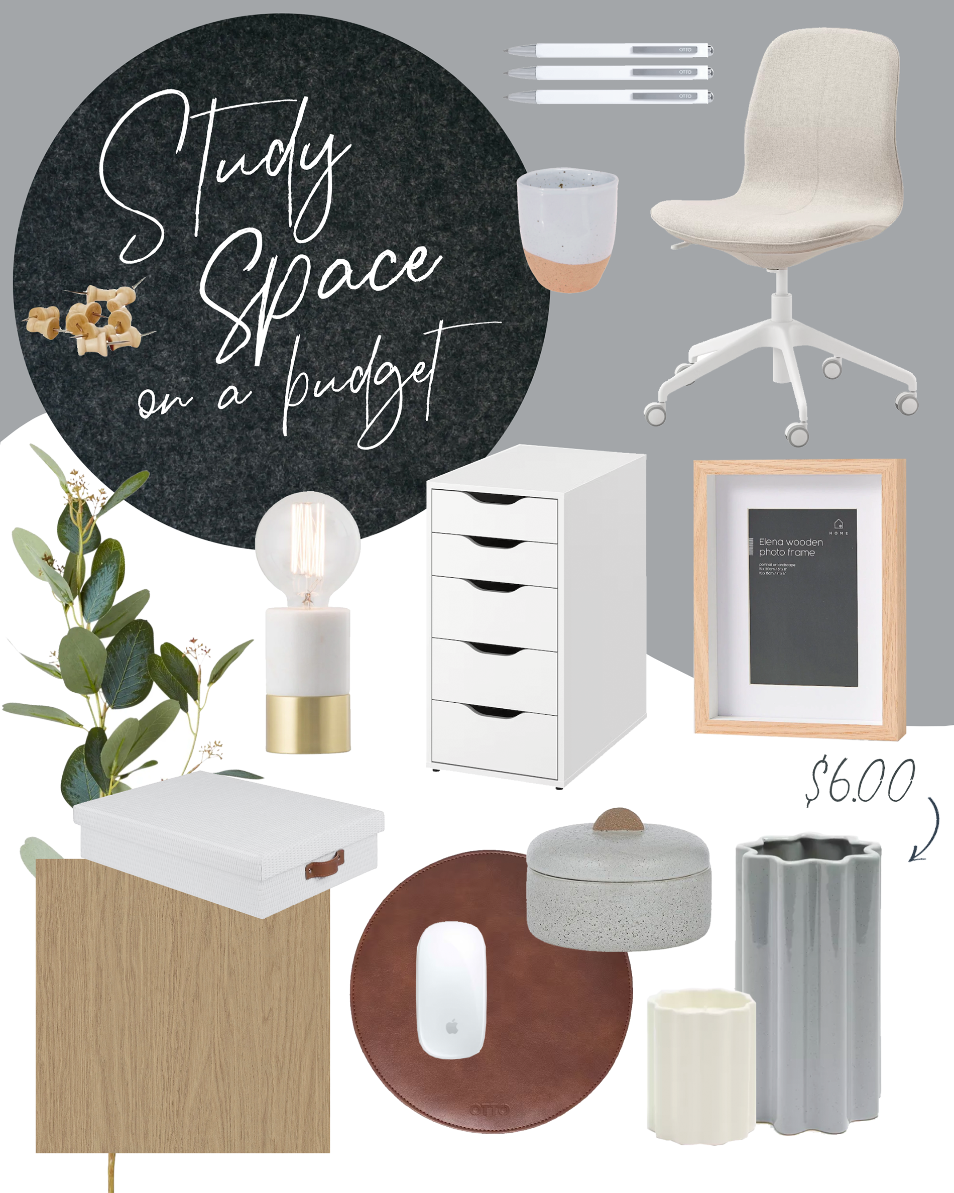 Other decor selections include the Elena photo frames from Target ($10.) They have a lovely white return on oak frame which is nice and thick- making the frame perfect for shelves as they sit upright by themselves (without needing a support arm.) The marble and brass lamp ($45) adds a touch of luxe, creates ambience and acts as an additional light source for night time work. The ceramic jar ($12) is a great trinket dish for small tech like usb devices, camera cords or to stash the candy you don’t want your children to eat! Lastly, don’t forget your greenery. It adds life to an area which can sometimes feel overwhelming and can be sourced affordably as artificial stems ($6) or pruned from your own garden.